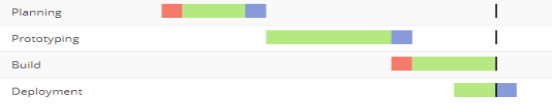 Displays a grid with details about the schedule of various Release Phases. The grid includes the Planned Start Date of every phase and displays a Gantt chart that illustrates each phase schedule. The bar graph is color-coded, and each section of the graph denotes the duration with respect to delay in start, actual duration, and schedule variance. The starting point of the graph indicates the planned start date of the release and the solid line indicates the planned end date.